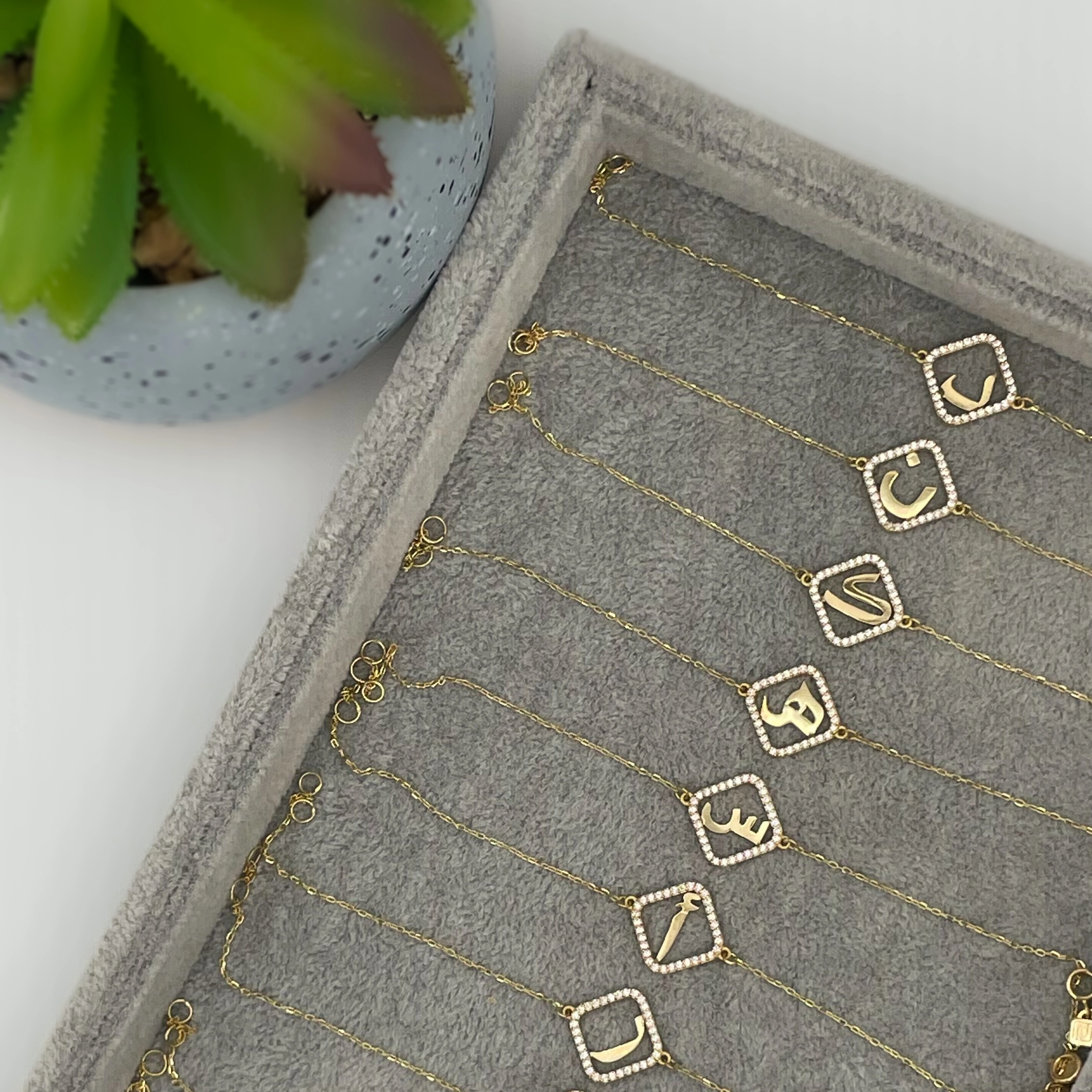 A delicate bracelet made of 18K gold and zircon, featuring your chosen initial in Arabic . Simple, elegant, and personal.